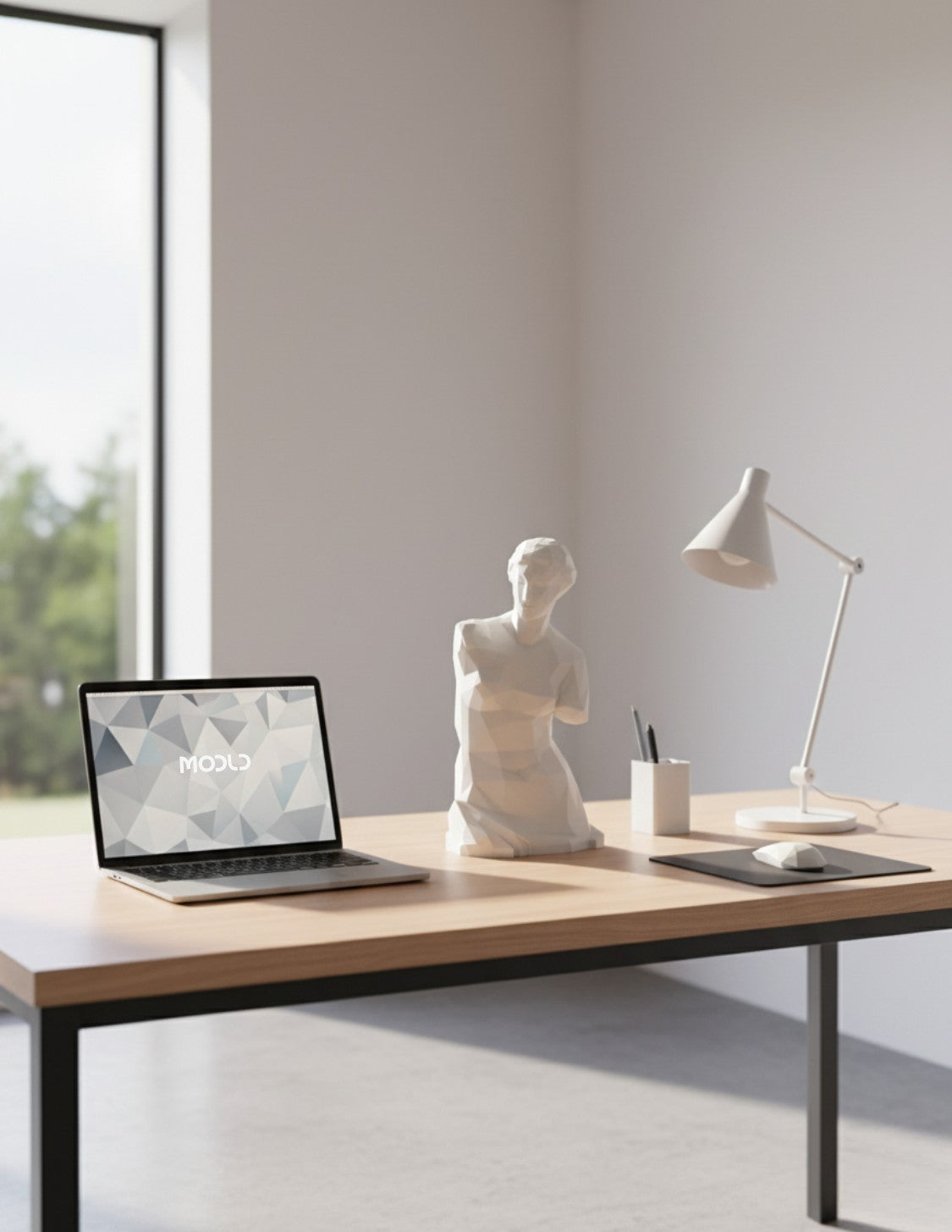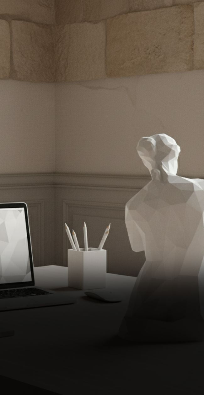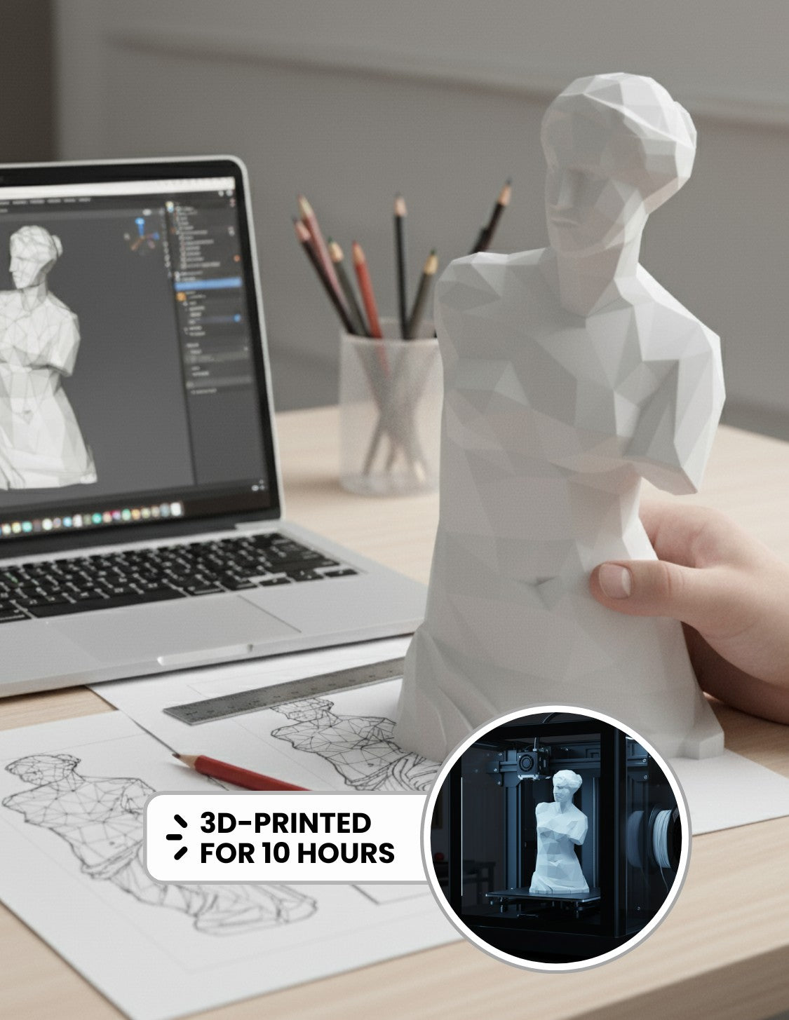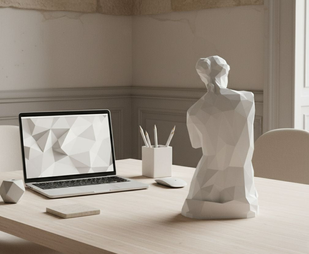 Goddess Mode brings timeless elegance through striking low-poly geometry. This standalone sculpture transforms any desk, shelf, or surface with its compact yet commanding presence. Quick assembly, matte finish, pure sophistication.