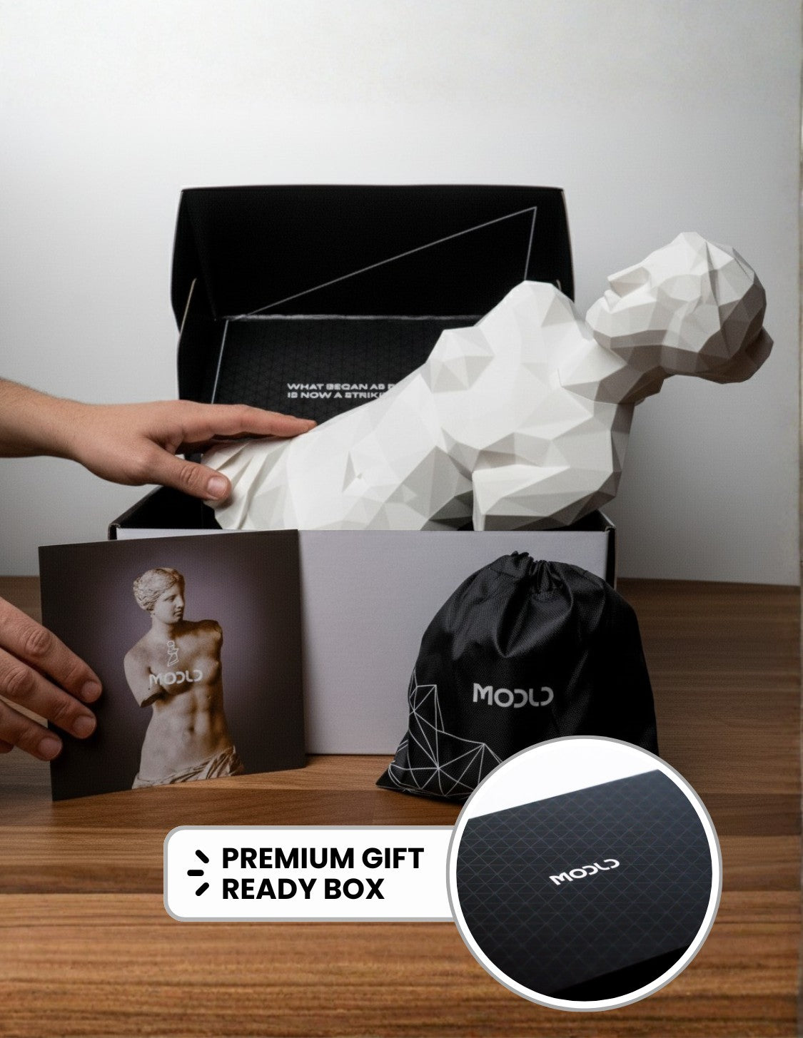 Yes! MODLDâs 3D-printed art comes in premium gift packaging, offering a luxurious unboxing experience. Perfect for gifting or elevating your own decor, the packaging ensures your low-poly wall statues arrive in pristine condition.