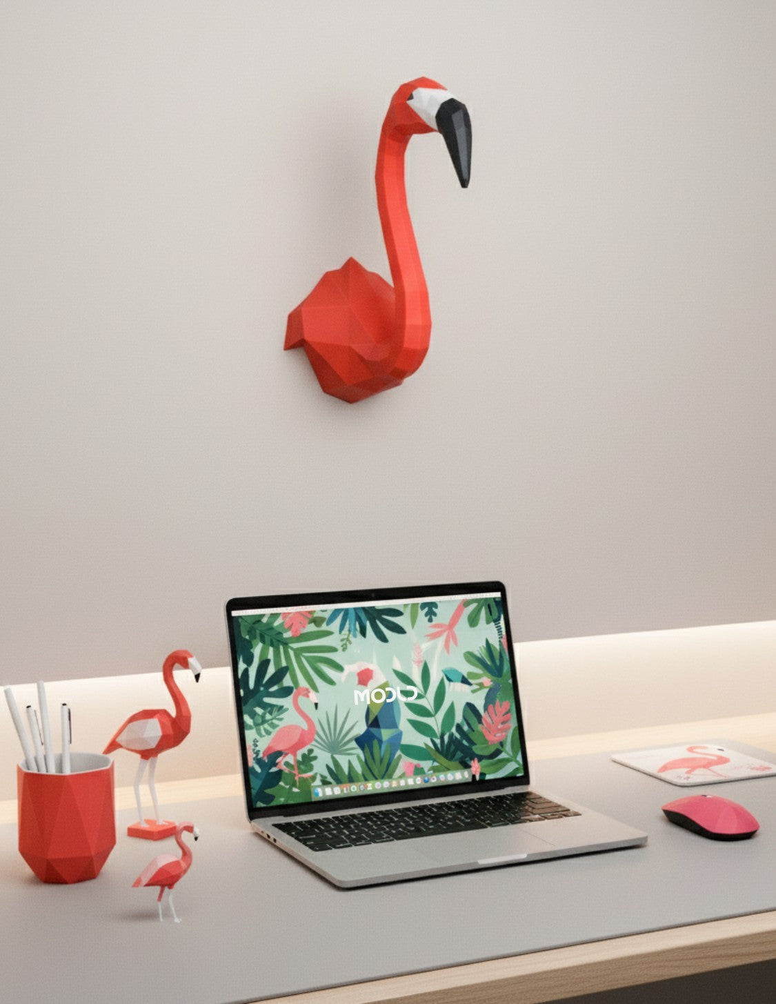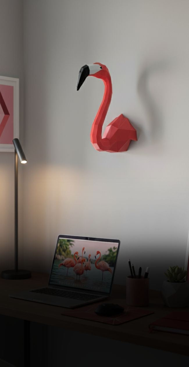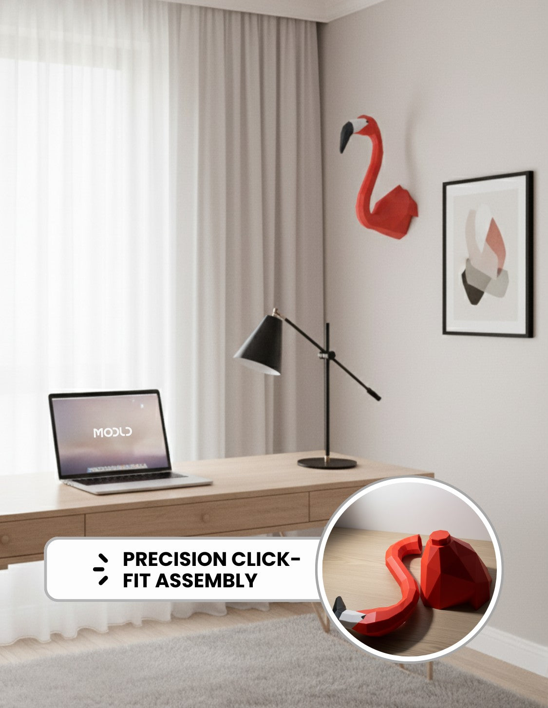 Pinkster brings vibrant low-poly design and unapologetic color to your space. Snaps together in seconds, mounts with our MODLD WallSnap™ system in moments. No nails, no damage, pure personality. Because every room could use a flamingo.